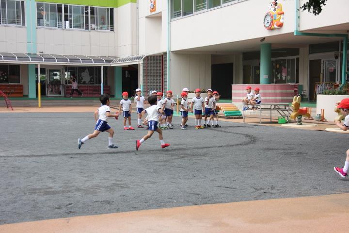運動会の内容・実施方法はまだ検討中ですが、外遊びの時間に子どもたちだけで集まってリレーを始めました。