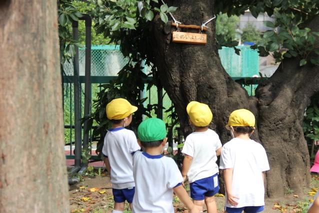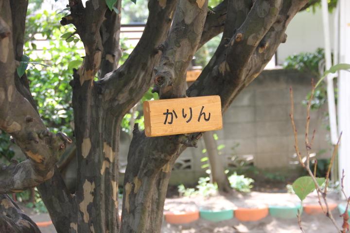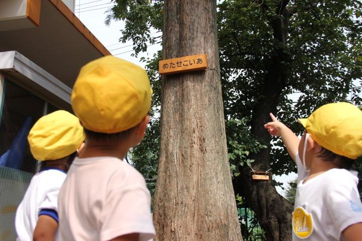 園児1人1人が名札をつけるように、園庭の木にも名札をつけました。